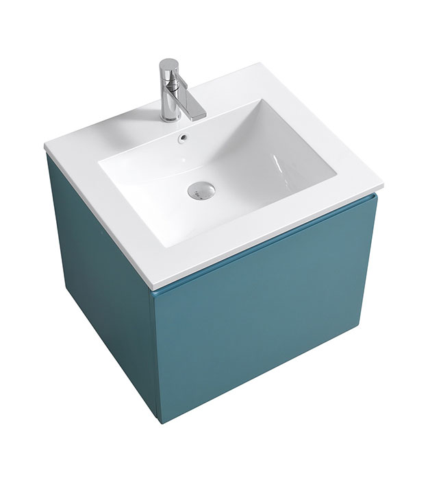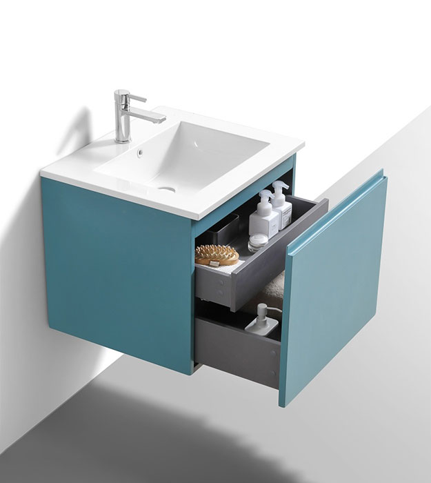 KubeBath Balli 24″ Modern Bathroom Vanity Wall-Mounted bathroom vanity features the large cupboard with one spacious drawer and one inner drawer for storing bathroom essentials. The clean, contemporary lines are enhanced by a crisp white integrated sink. Available in Gloss White, White Oak and Teal Green Finishes.