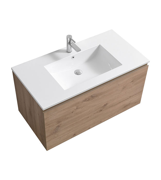 KubeBath Balli 40″ Modern Bathroom Vanity Wall-Mounted bathroom vanity features the large cupboard with one spacious drawer and one inner drawer for storing bathroom essentials. The clean, contemporary lines are enhanced by a crisp white integrated sink. Available in Gloss White, White Oak and Teal Green Finishes.