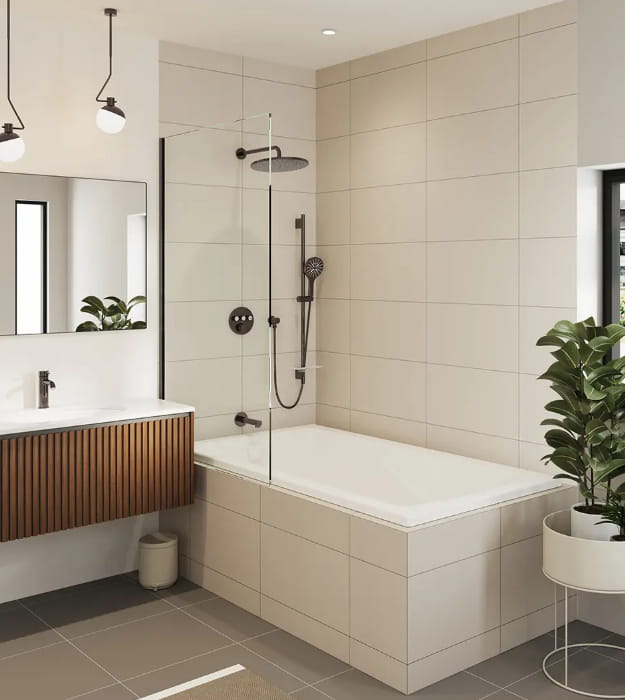 The kit features a large 310 mm Rainshower head with a soothing PureRain spray, a multi-function SmartActive hand shower with selectable spray modes, and a sleek slide bar with an integrated tray for added practicality. A durable metal hose, wall union, and tub spout complete the set, all finished with GROHE’s long-lasting coating for enhanced durability and shine.