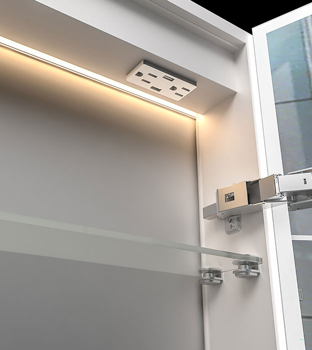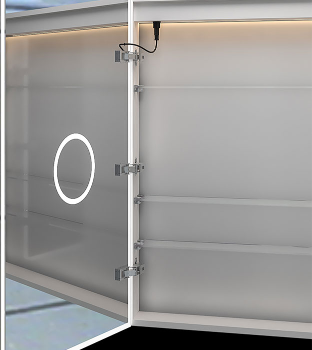 The ICO Nova LED medicine cabinet is a stylish and functional upgrade for any modern bathroom. It features interior and exterior LED lighting, adjustable glass shelves, 12V power with USB charging ports, and a built-in 3x magnifying mirror on the cabinet door.