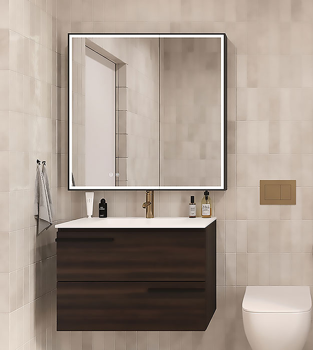 The Nova can be installed as either surface-mounted or recessed, offering flexibility for different bathroom designs. All ICO LED mirrors include dimmable brightness and color temperature control, with touch-activated illuminated buttons or the option to connect to a wall switch.