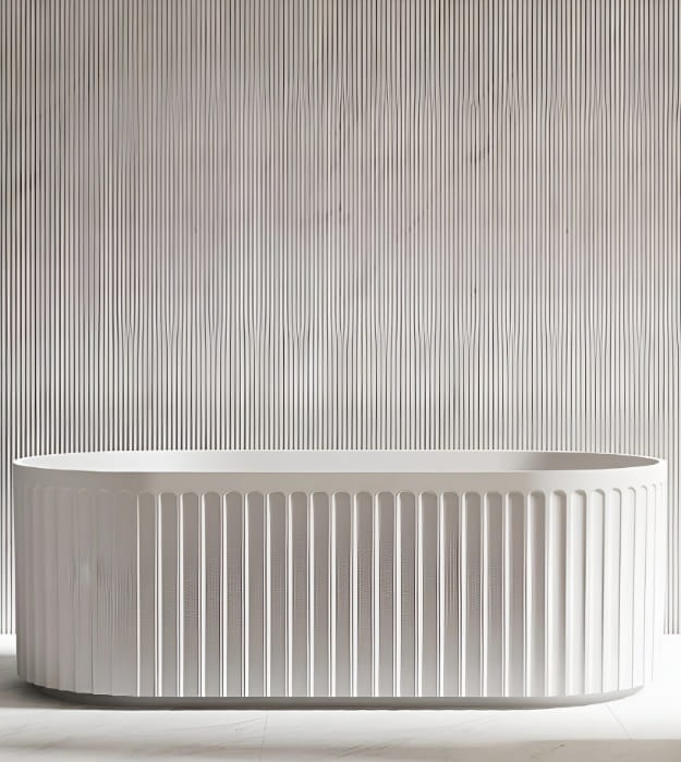 The Kodaen Doric Freestanding Bathtub DORIC7111 brings sculptural elegance and modern luxury to any bathroom space. Inspired by classical fluted column design, its distinctive ribbed exterior adds depth, texture, and architectural character, making it a true centerpiece. The smooth oval silhouette offers a spacious and ergonomic bathing experience, while the crisp matte white finish enhances its clean, contemporary appeal.