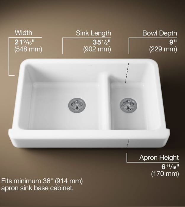 The KOHLER Whitehaven apron-front kitchen sink K-6426-0 features a streamlined and versatile farmhouse style to complement any decor. Perfect for remodeling projects, Kohler Whitehaven K-6426-0 has a shortened apron that allows for installation on most new or existing 36-inch standard cabinetry. The Self-Trimming® design requires only a simple rough cut, overlapping the cabinet face for beautiful results and easy installation. A low barrier divides the two compartments, making it easy to wash and rinse large items while still keeping the two basins separate.