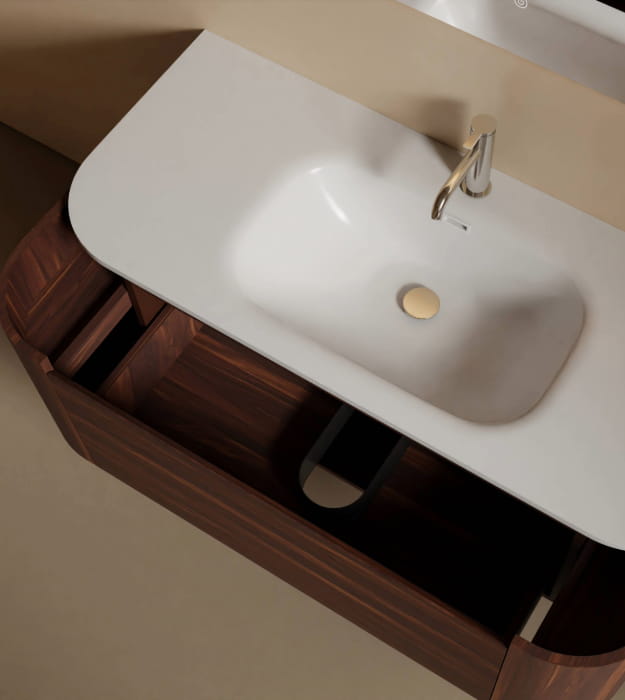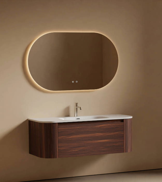 Saniterica’s Pebble PAPB48NWL 48″ Luxury Walnut Floating Vanity brings refined elegance to modern bathrooms with its clean lines and sculptural presence. Crafted with a rich Walnut wood veneer finish, the wall-mounted design creates a light, spacious feel while showcasing exceptional craftsmanship. The seamless integrated solid surface countertop adds a sleek contrast, offering a smooth, durable surface that enhances the vanity’s minimalist aesthetic.