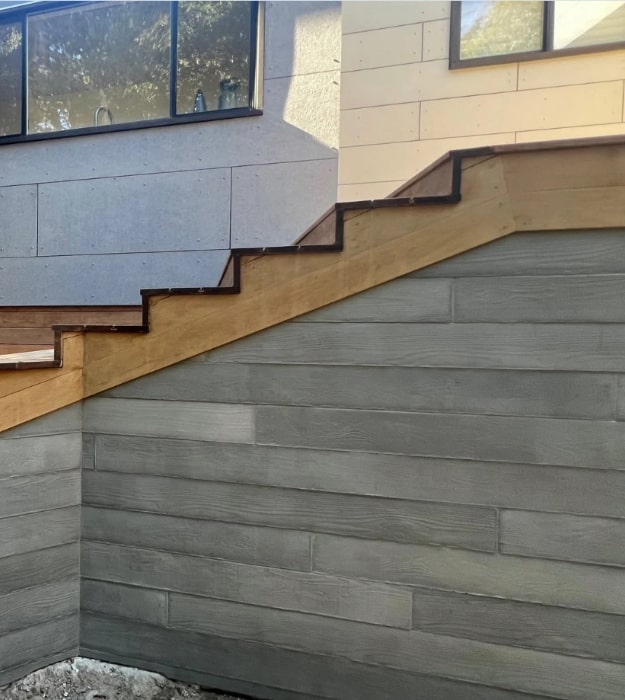 Weighing only 2.5 lb/sq.ft. RealCast Board-Form Concrete Wall Panels are fastened to the wall by using the recommended adhesive or thin-set mortar as outlined in the RealCast Install Instructions. Each panel has staggered edges to help hide vertical seams, and once the concrete panels are mounted and installed you won’t be able to notice that it was not created using traditional forms. RealCast Board-Form panels are easily cut with a mitre saw using a masonry blade, and installed using simple tools.