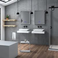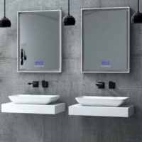 Slik Portfolio Solid Surface Smart rectangular led mirror has an LED display a lighting with Bluetooth functionality.