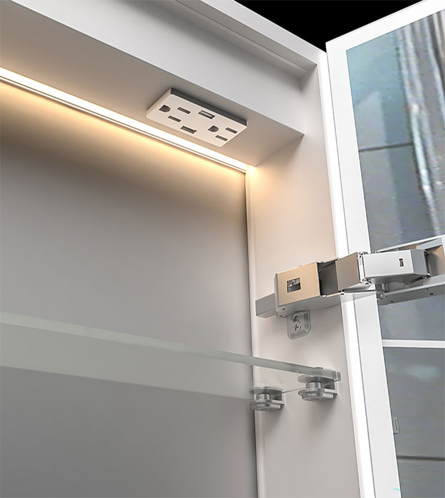 The ICO Jackson LED medicine cabinet IJ11 is a beautiful addition to any bathroom with interior lighting, glass shelves, and also 12 volt power with USB plugs for charging devices. The Jackson has an interior 3 x zoom magnifying mirror on the inside of the door.