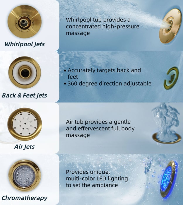 - Stainless Steel Jets: Stainless steel sanitary full-draining jets, underwater chronotherapy light, spaciously designed to provide maximum bathing space with wide and deep bathing wells